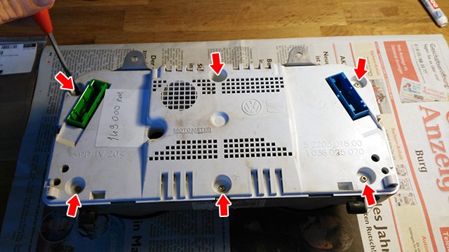 - Schritt 2: Tacho umdrehen und die mit den roten Pfeilen markierten T10 Schrauben lösen. Dann wieder umdrehen.